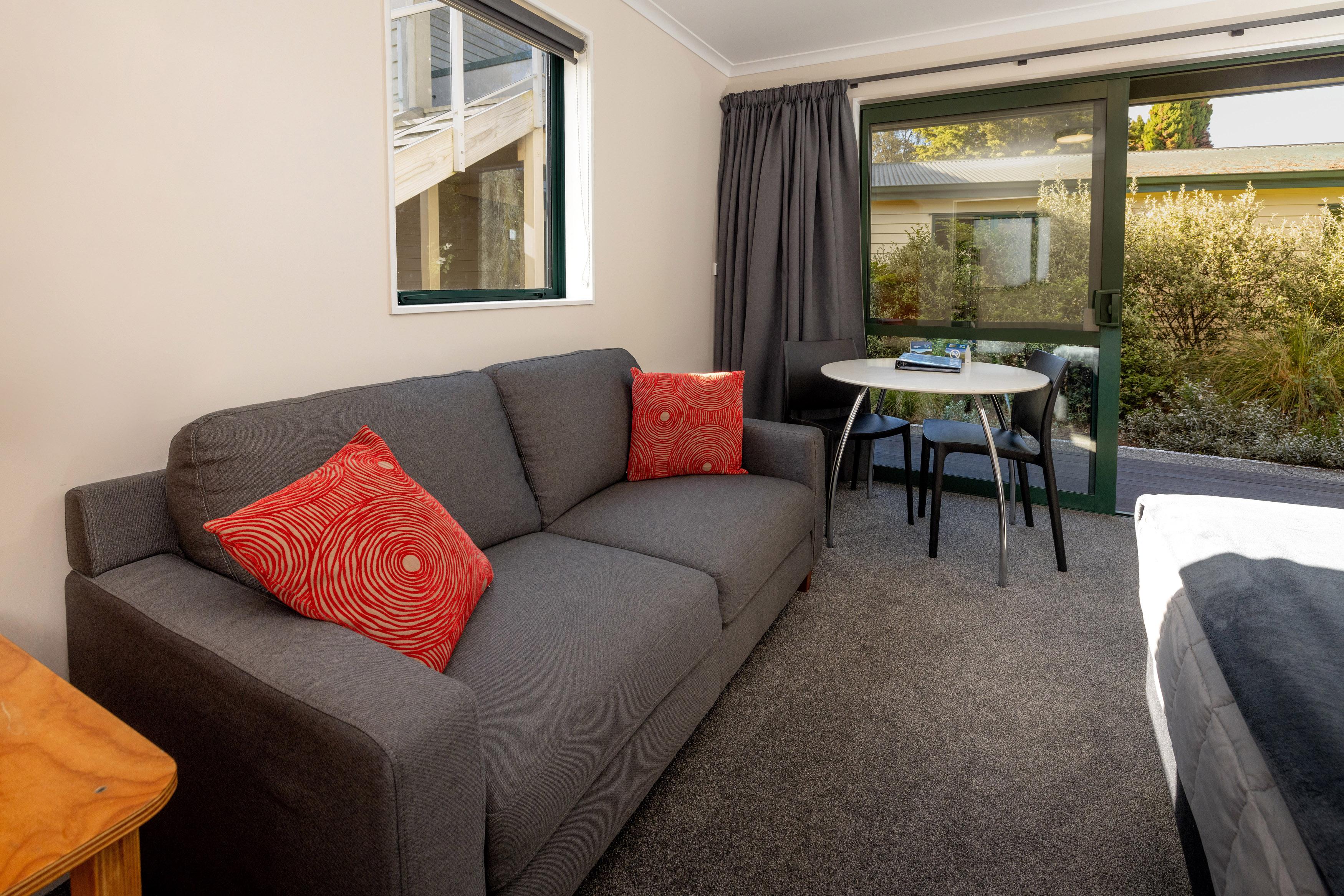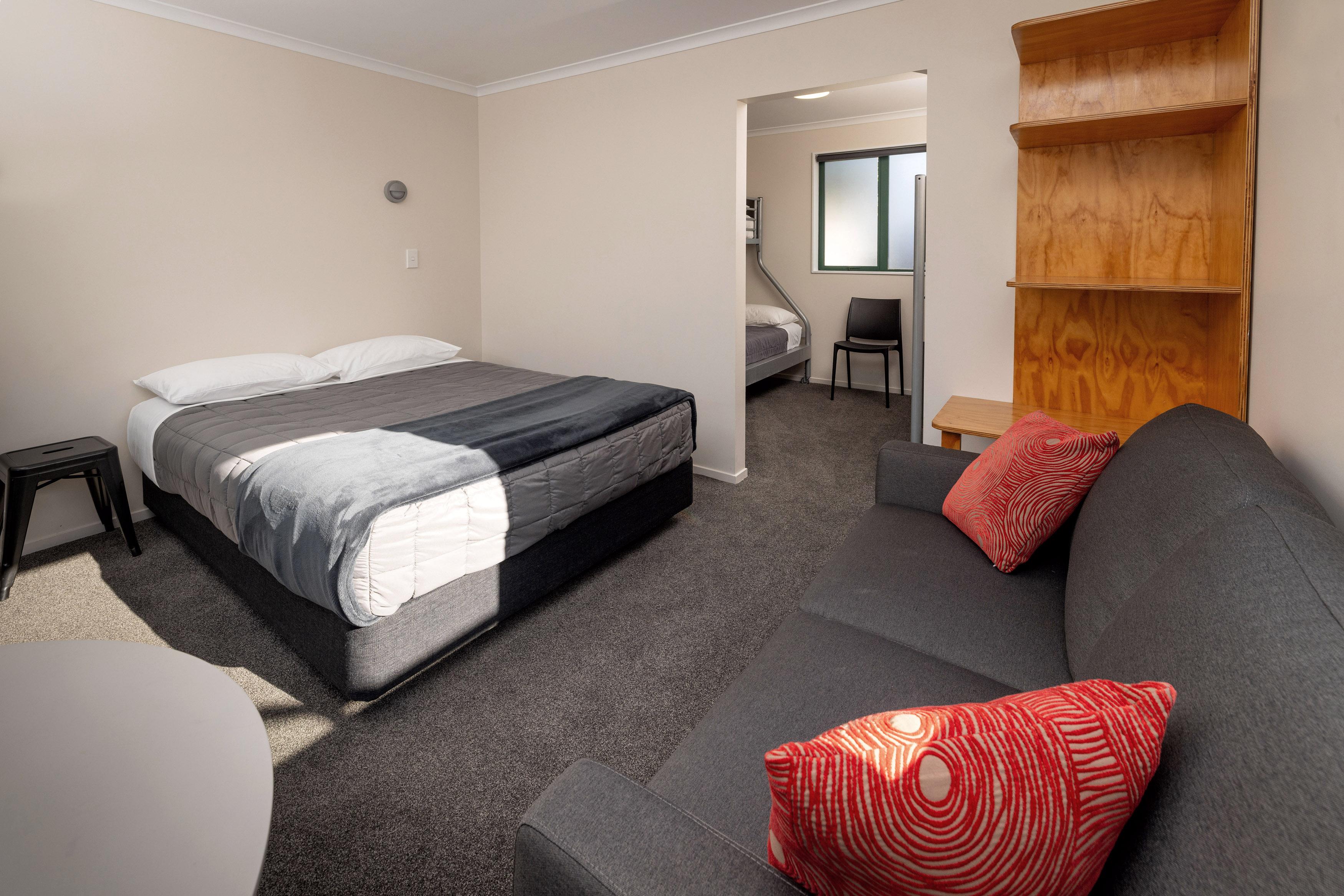 Living & Dining Area: Queen bed, dining table and chairs, plus a comfy couch.